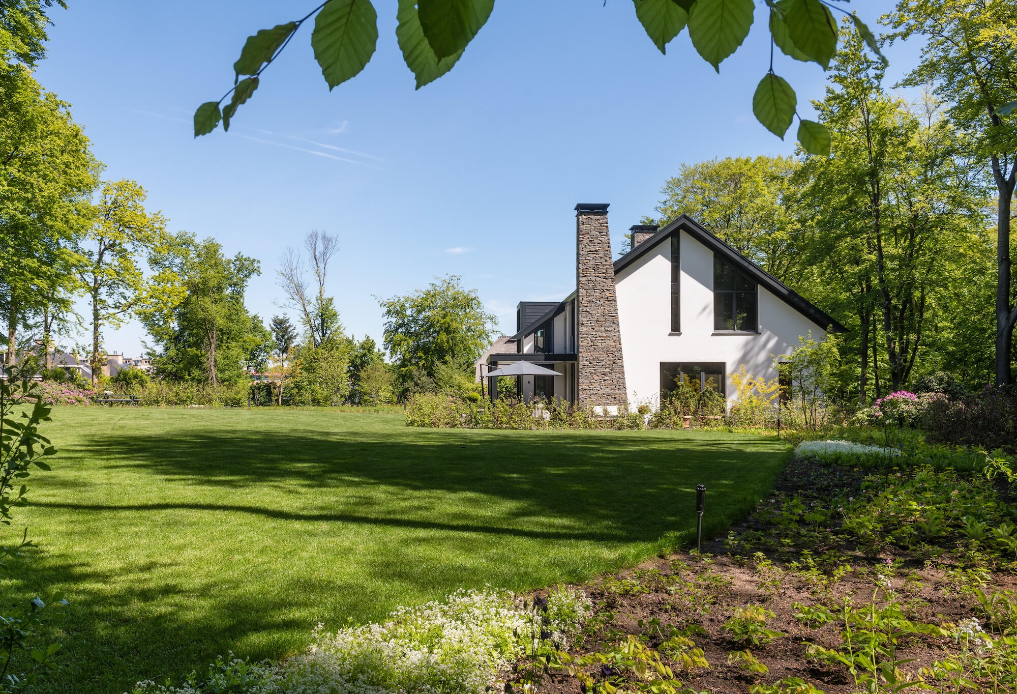 Deze moderne strakke villa kreeg een ware eyecatcher aan de woning. De schoorsteen is uitgevoerd in onze Natuurgevelsteen Karlovy Vary. Deze mix van grijze en bruine kleurnuances staat in contrast met het witte stucwerk en valt daarom extra op. Een prachtig eindresultaat! Fotografie: Lisette van de Pavoordt