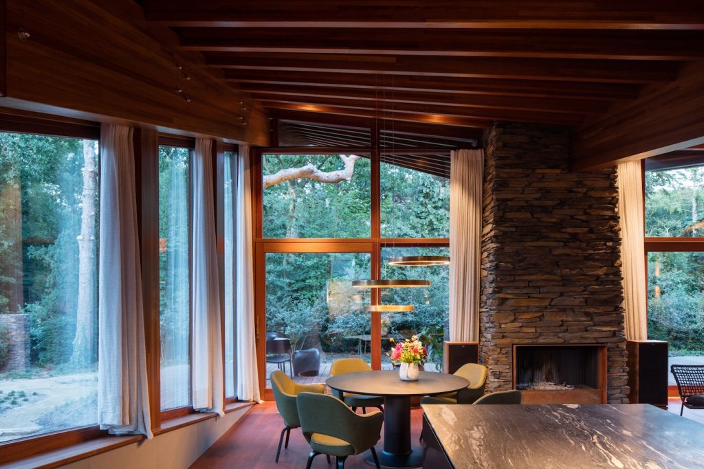 Ook binnen werd dezelfde natuursteen sortering toegepast. Zo loopt de gevel op bepaalde plekken van buiten naar binnen door en werd de haard omlijst met natuursteen. Dit bevordert niet alleen de samenhang in het ontwerp, maar hierdoor kunnen de binnen- buitenruimtes ook op bijzondere wijze in elkaar overlopen. Het interieur wordt op deze manier betrokken bij de buitenruimte en dus ook bij de natuurrijke omgeving van de villa.