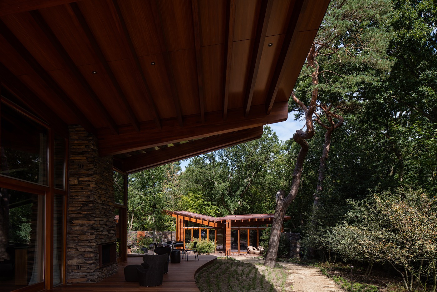 Deze bosvilla kreeg vorm en werd gebouwd met het streven volledig op te gaan in de natuur. Hout en een natuurstenen gevel bepalen dan ook het aanzicht van deze prachtige villa. De keuze voor deze materialen is weer terug te herleiden naar de omringende natuur. Maar naast natuurlijk materiaalgebruik waren het ook de organische vormen en de indeling die ervoor zorgden dat de woning volledig ingebed kon worden door de natuur. Er werden zowel gesloten als open ruimtes gecreëerd, zodat de bewoners op ieder moment van de dag wel een ruimte kunnen vinden die aan hun wensen voldoet.