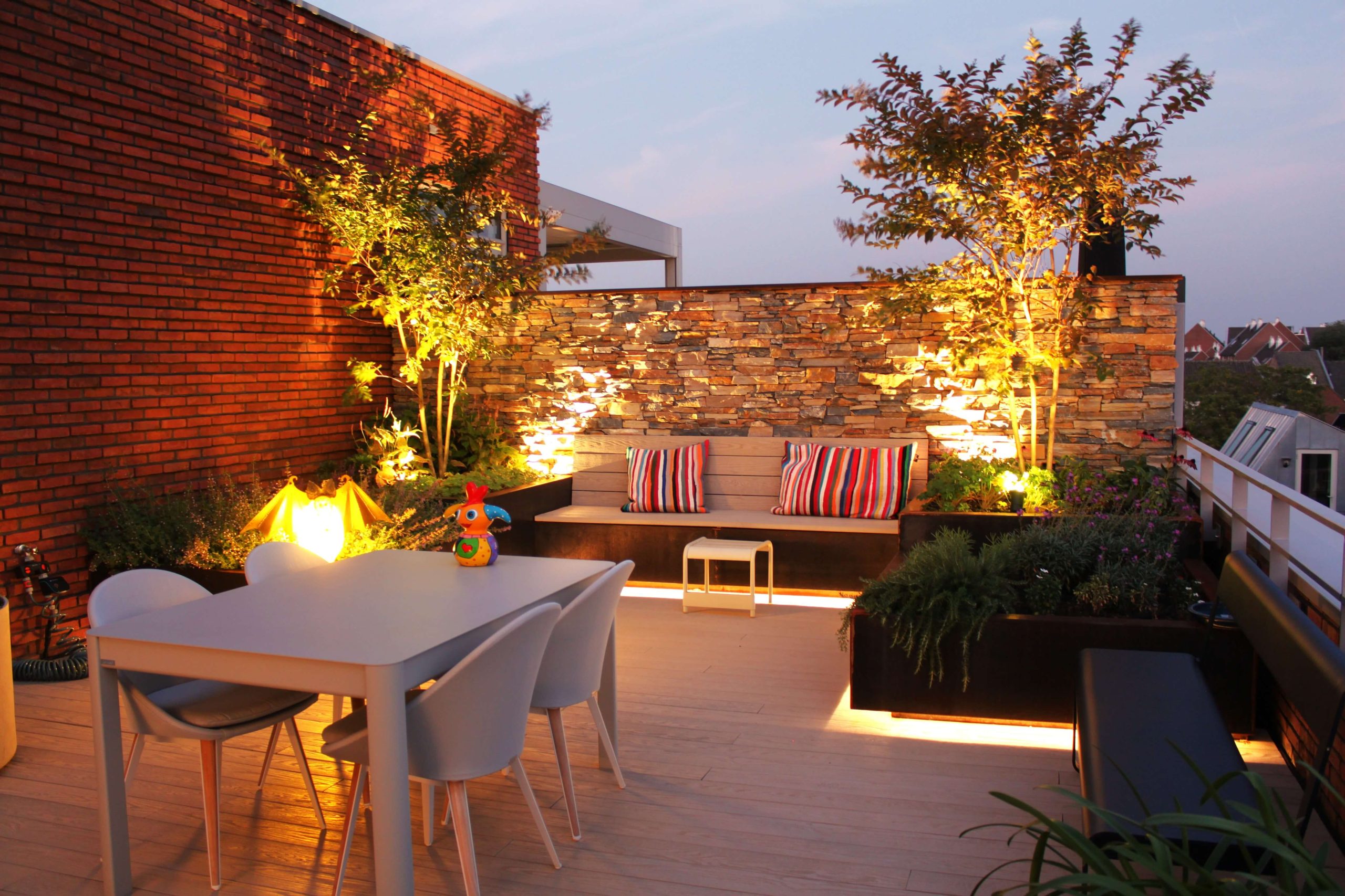 Dit ruime dakterras werd omgetoverd tot een gezellige en fijne plek. Meerdere factoren hebben bijgedragen aan het creëren van een sfeervolle daktuin. Zo komen de diverse plantenbakken, het moderne meubilair, de verlichting en de natuursteen wand perfect samen. Er is gekozen voor onze Bukarest strips, een mooie natuurlijke mix van blauwe, gele en bruine kleurtinten. Een prachtige plek om te genieten!