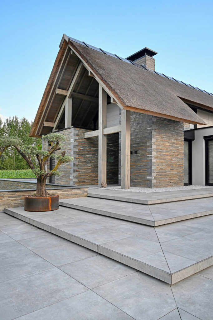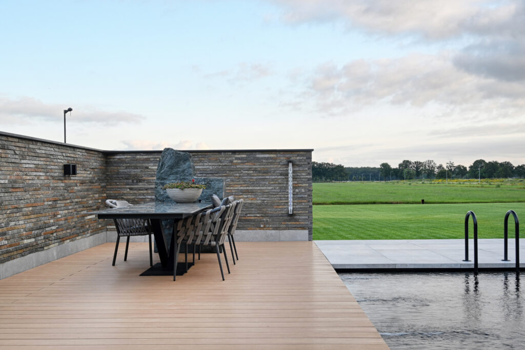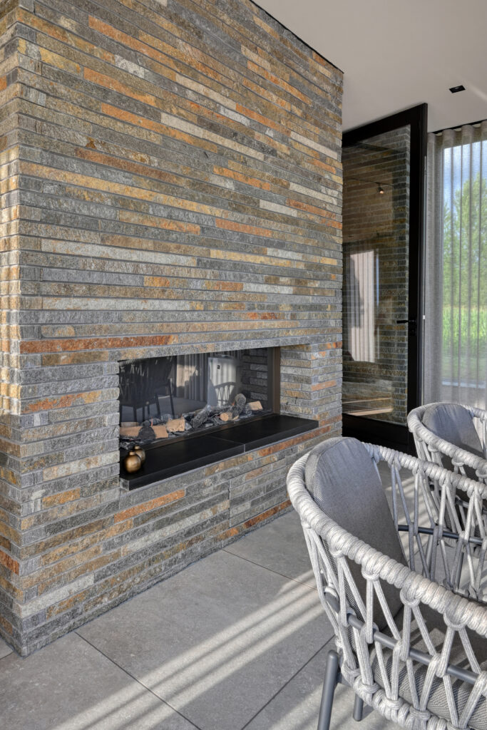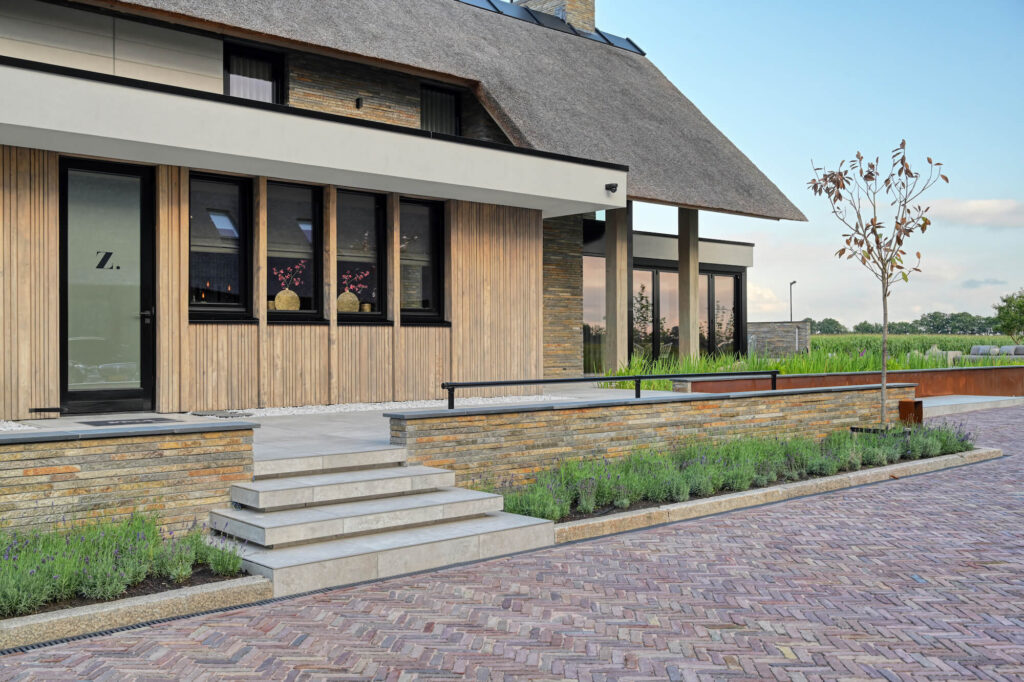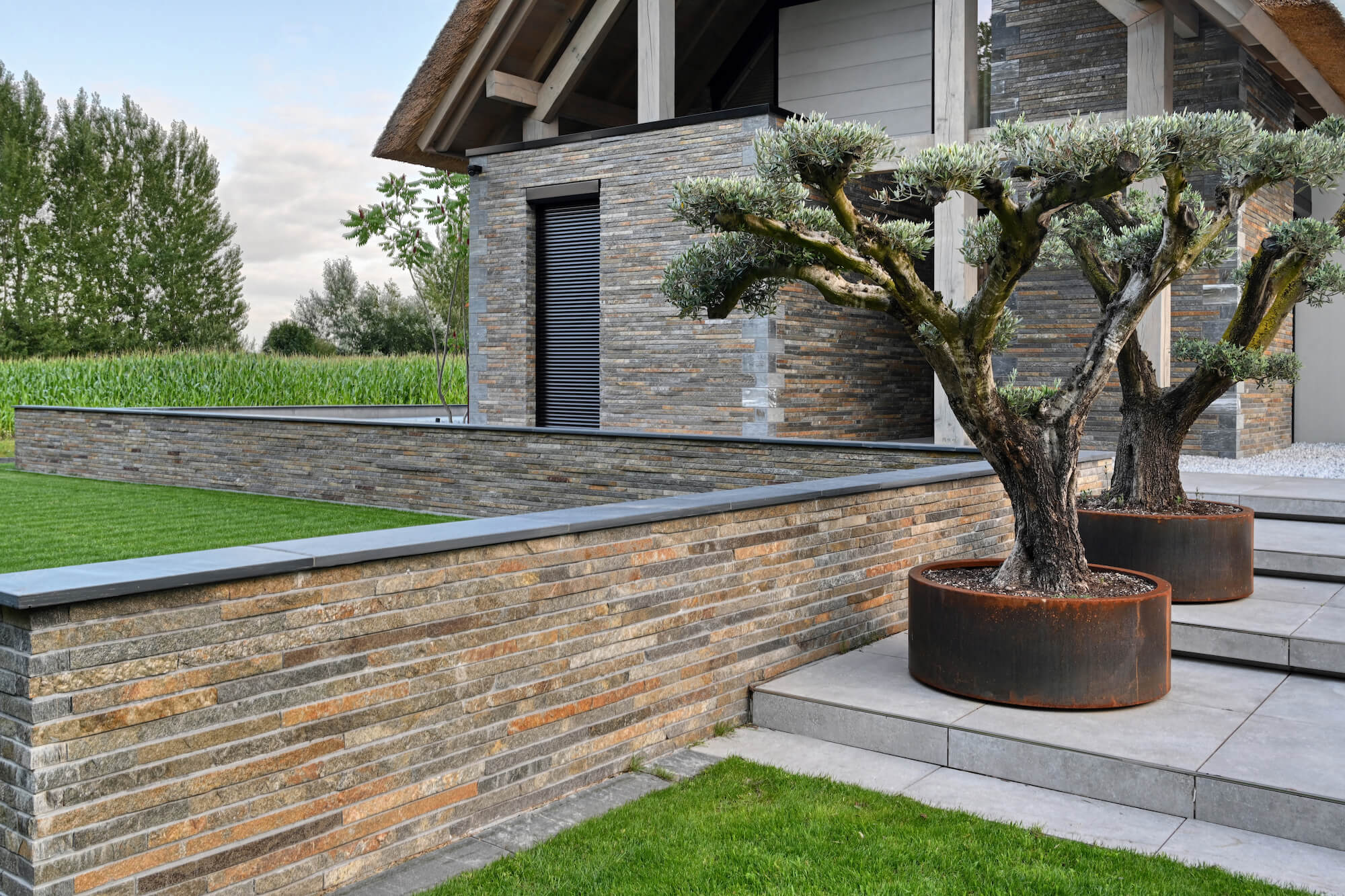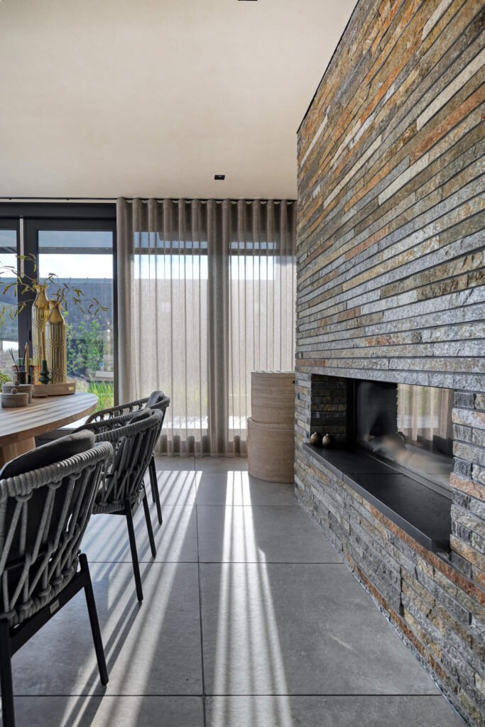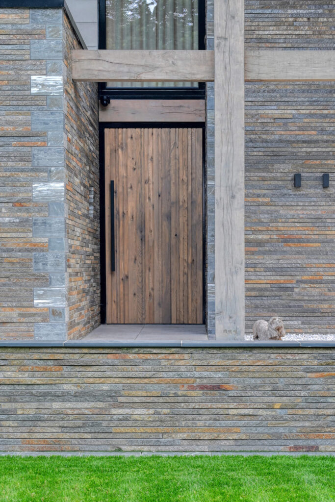 De Droomvilla Hollandscheveld is een modern woonproject waarin natuursteen de hoofdrol speelt. Van de gevel tot de tuin en het interieur is natuursteen op unieke wijze toegepast, met oog voor detail en vakmanschap. Voor dit project is gekozen voor de Lapide Bricks in KV12, een gevelsteen gemaakt van 100% natuursteen. Deze steen combineert de uitstraling van traditioneel metselwerk met de pure, robuuste textuur van natuursteen. Het resultaat is een gevel die tijdloos én onderscheidend is — perfect passend bij de moderne architectuur van deze villa. Niet alleen aan de buitenzijde, maar ook in de tuin en het interieur is natuursteen toegepast. Grove natuursteenelementen zorgen voor een krachtig lijnenspel, terwijl de fijnere afwerkingen binnen zorgen voor rust en luxe. Zo vormt natuursteen de verbindende factor in het totale ontwerp. De Lapide Bricks zijn niet alleen esthetisch, maar ook duurzaam. Gemaakt van een herbruikbaar, natuurlijk materiaal dragen ze bij aan een lange levensduur en een milieuvriendelijke bouwstijl. Droomvilla Hollandscheveld laat zien wat er mogelijk is wanneer natuursteen centraal staat — puur, tijdloos en duurzaam. Garagedeur op maat: Different Doors, Fotografie: Henk Sieders. The Art of Living magazine – Fotografie: Jaro van Meerten.