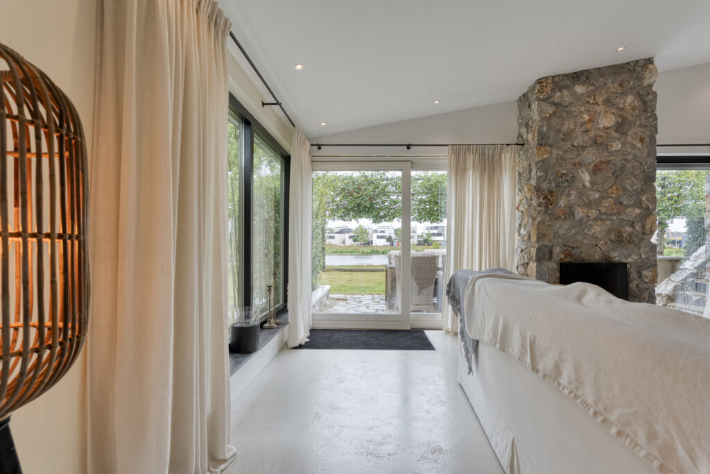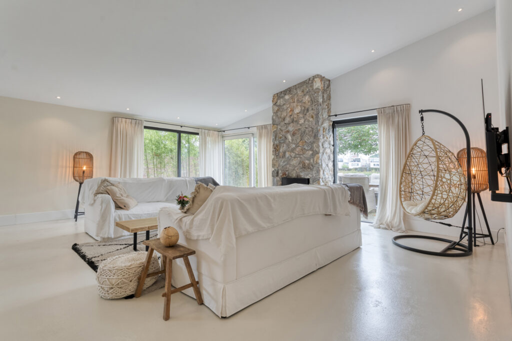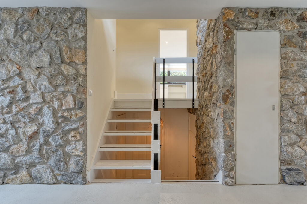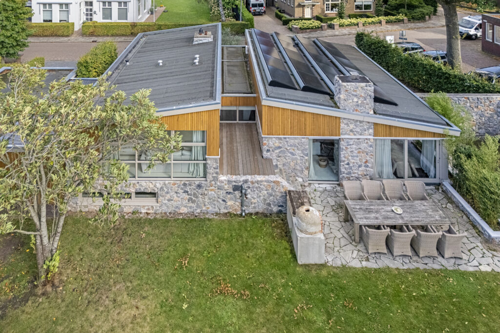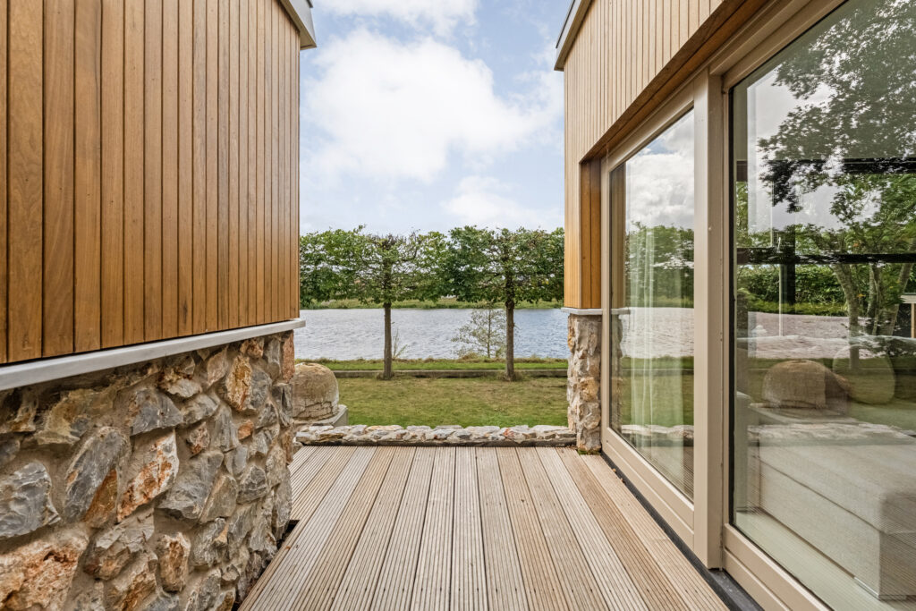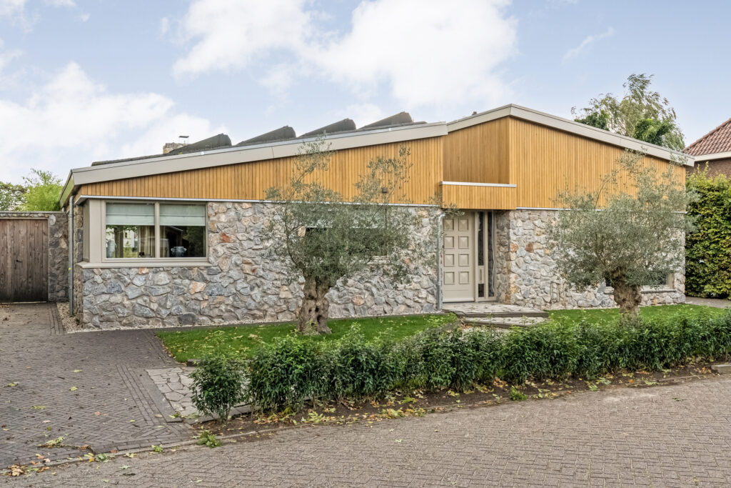 De combinatie van natuursteen met verticale houten gevelbekleding zorgt voor een uitgebalanceerd geheel. Waar het natuursteen zorgt voor robuustheid en massa, brengt het hout warmte en verfijning in het ontwerp. Deze wisselwerking versterkt de architectuur van de bungalow en zorgt voor een duidelijke gelaagdheid in de gevel. Door bewust te kiezen voor natuurlijke materialen ontstaat een tijdloos ontwerp dat zowel modern als ingetogen oogt en perfect aansluit bij de groene omgeving.