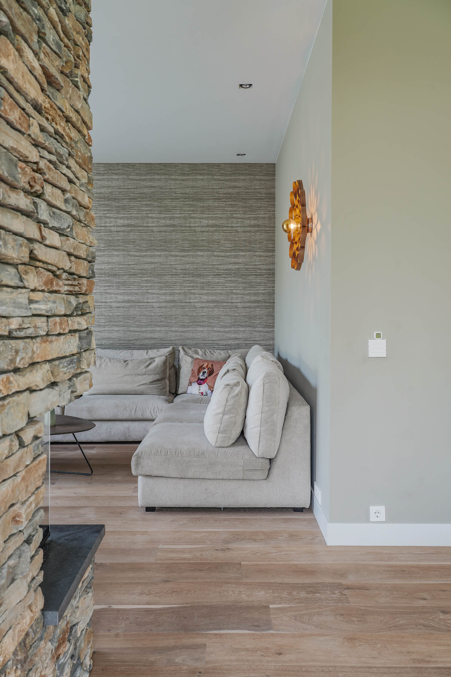 Ook binnen in de villa komt natuursteen terug, wat de verbinding met de natuur versterkt. De gezellige openhaard, gemaakt van hetzelfde natuursteen als de gevel, vormt het hart van de woonkamer. De bruine, blauwe en gele tinten van de steen zorgen voor een warme en uitnodigende sfeer, die perfect past bij het moderne interieur. Dit gebruik van natuursteen in zowel het exterieur als het interieur benadrukt de eenheid tussen de woning en haar natuurlijke omgeving.