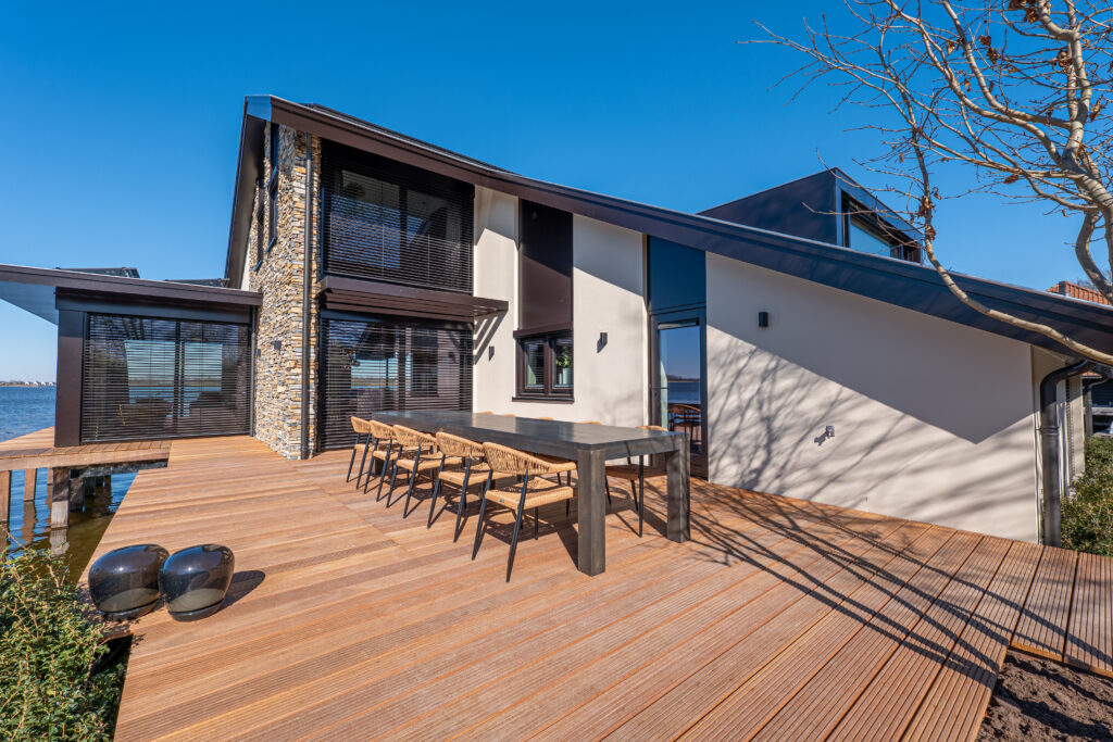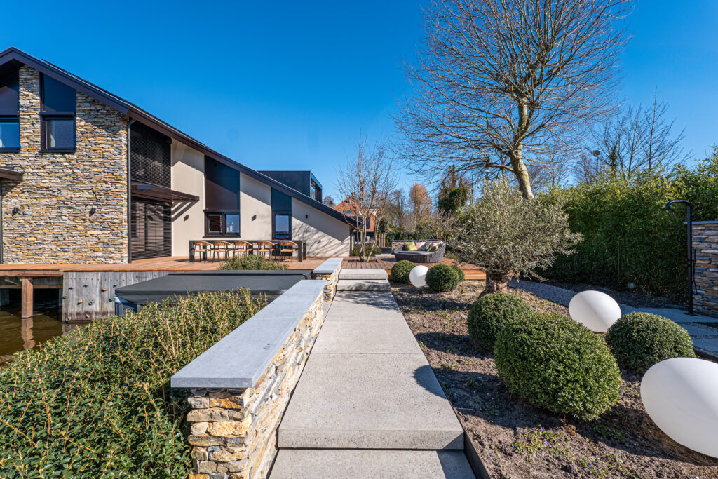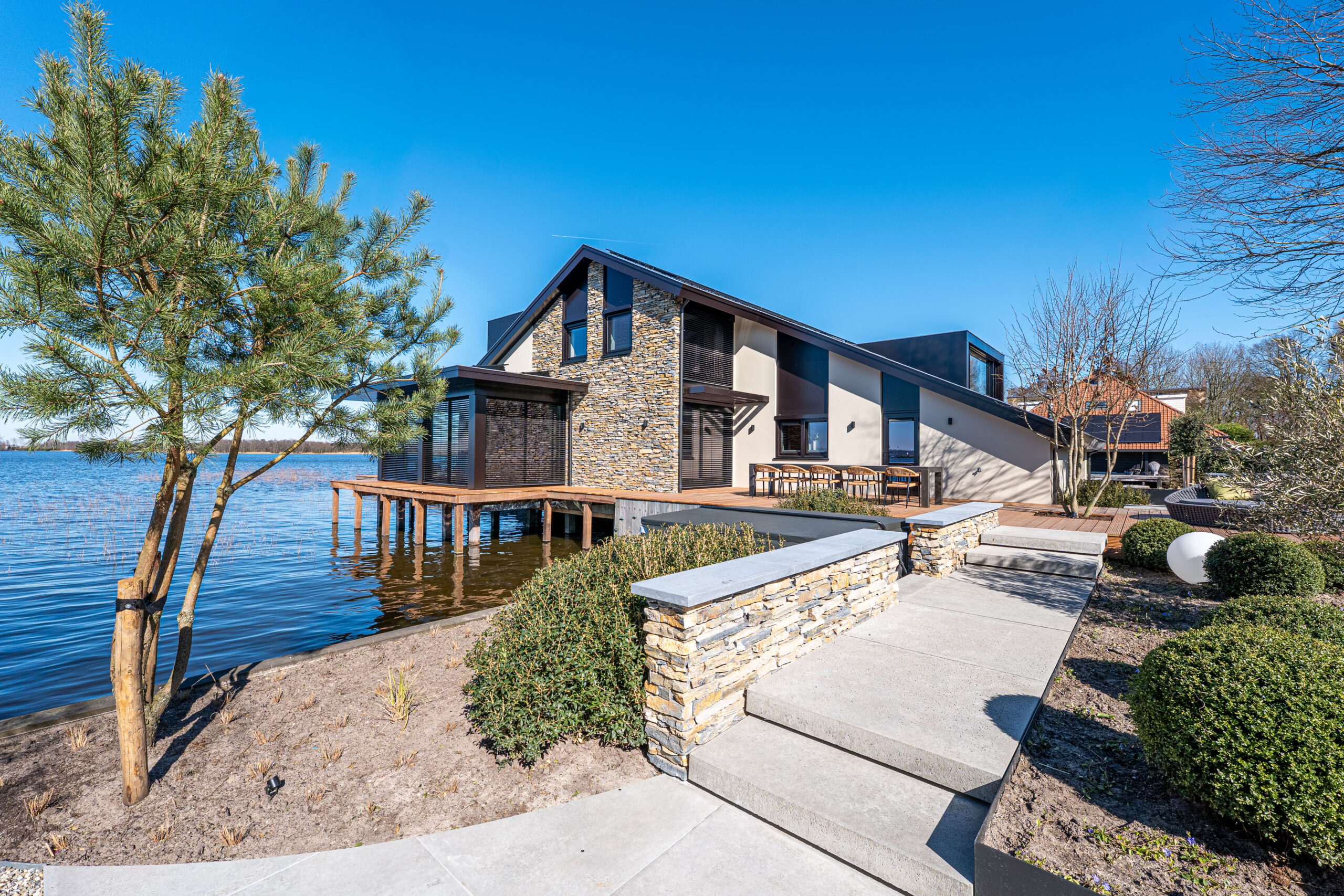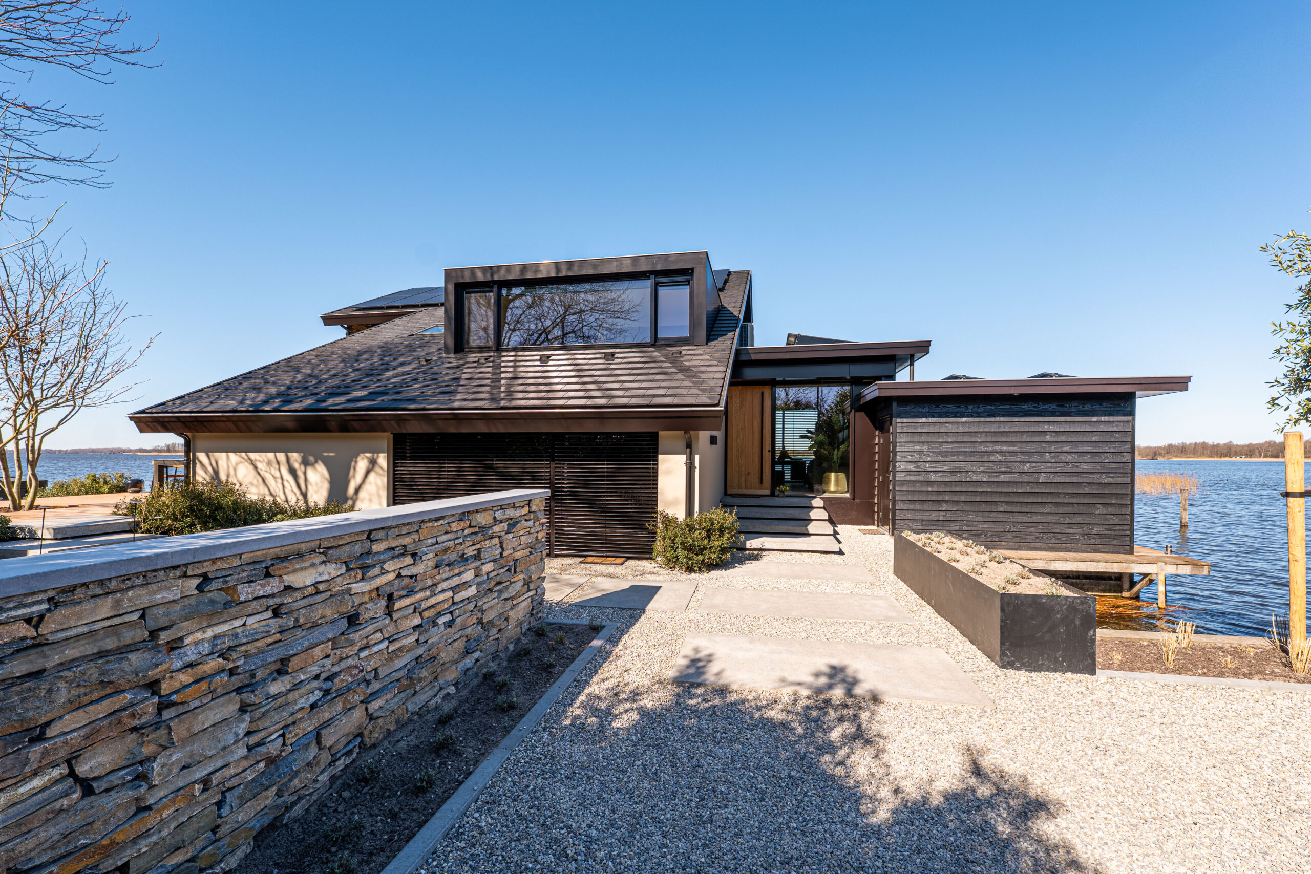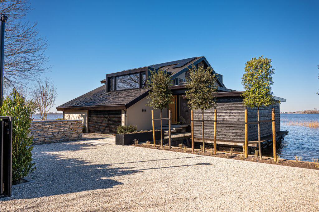 Op een unieke plek aan de Loosdrechtse plassen staat deze moderne villa die direct opgaat in het omliggende waterlandschap. De gevels zijn deels bekleed met onze gneis Natuurgevelsteen Bukarest, die met zijn rijke schakeringen en gelaagde structuur een stoer, natuurlijk karakter toevoegt. Het samenspel van steen, hout en grote glasvlakken geeft de woning een warme maar eigentijdse uitstraling. Dankzij de combinatie van hoogwaardige materialen en de unieke ligging ontstaat een exclusieve woonbeleving aan het water.