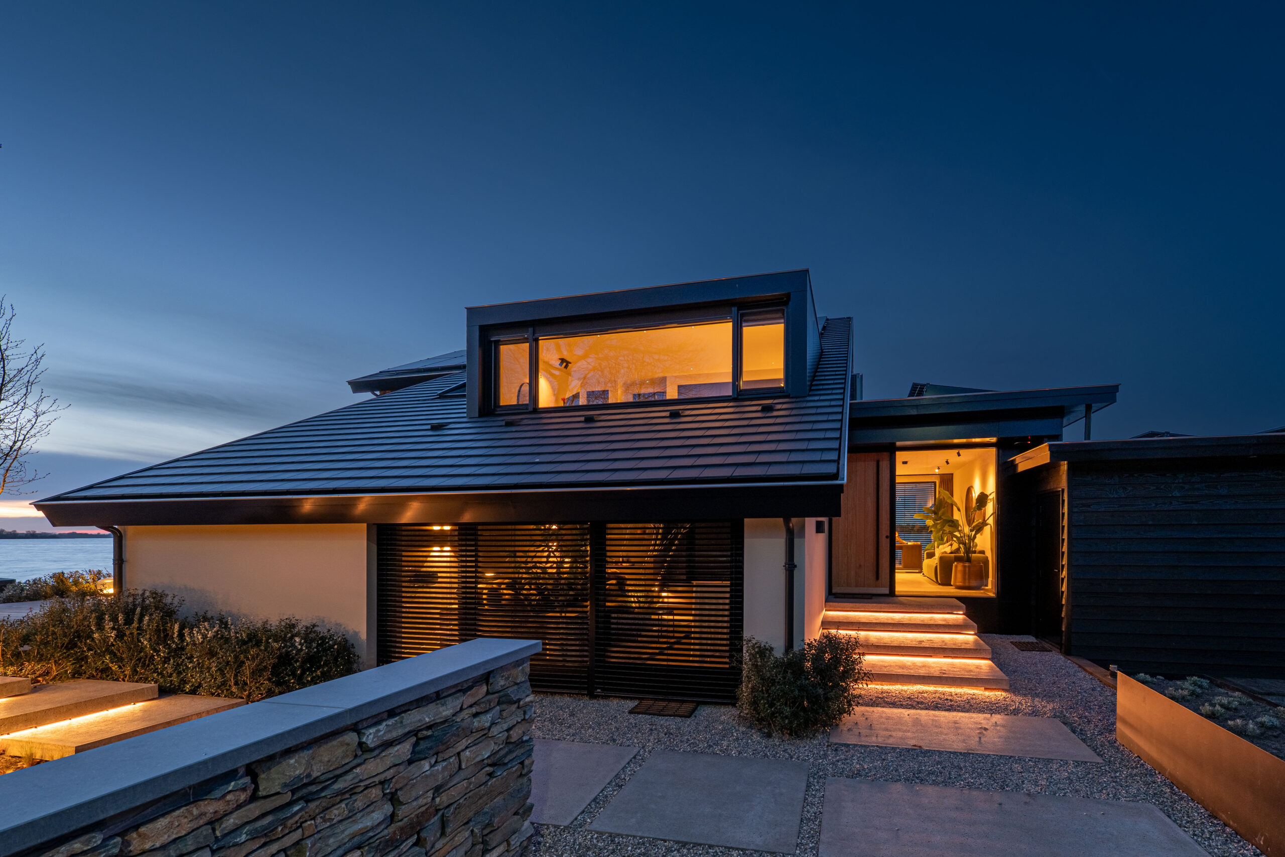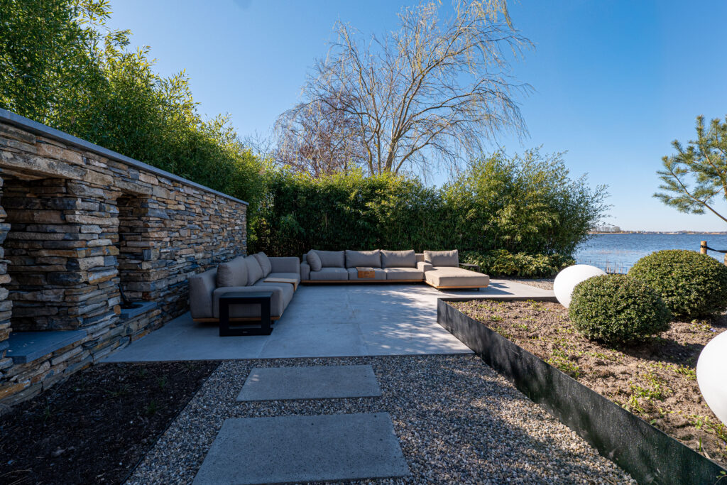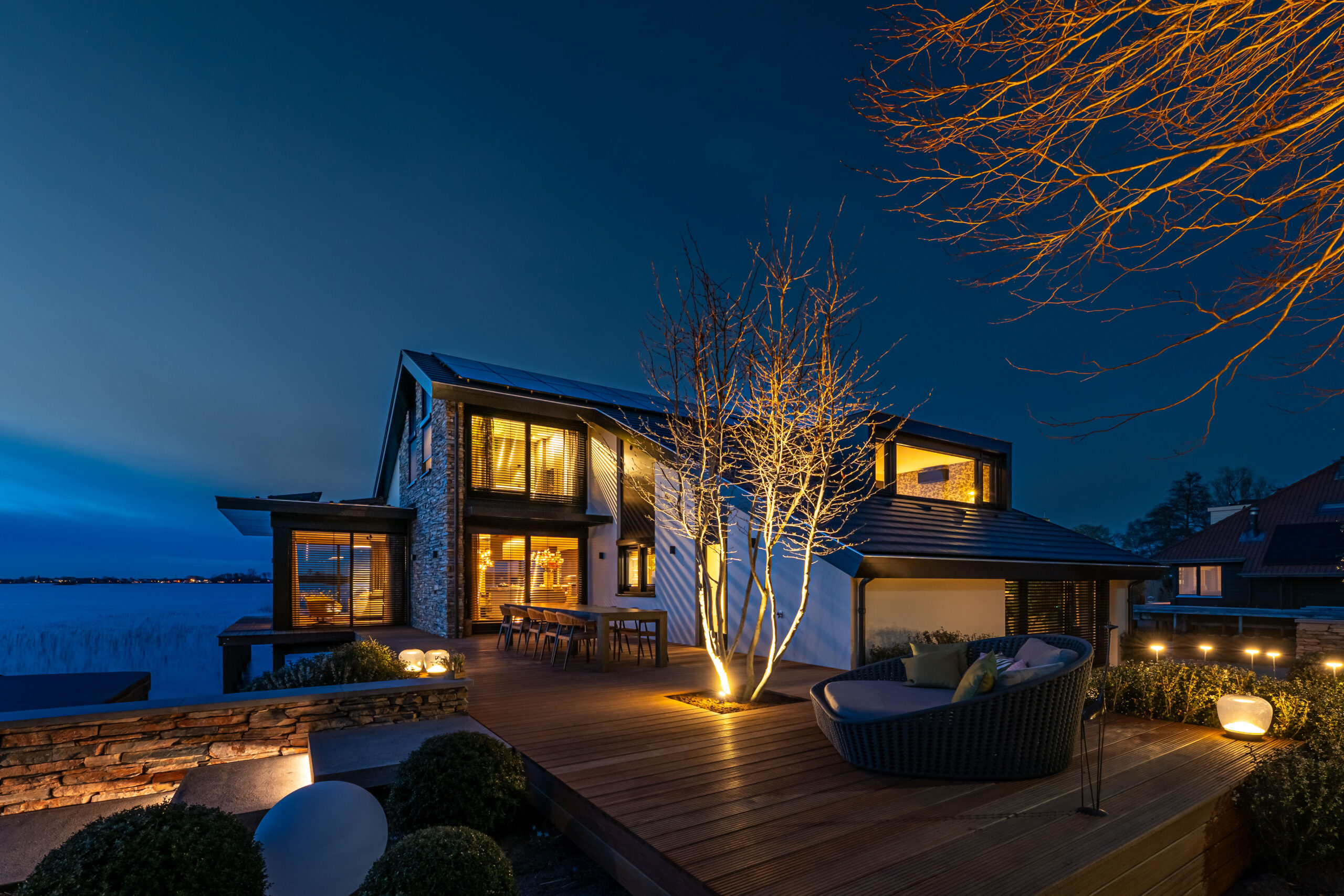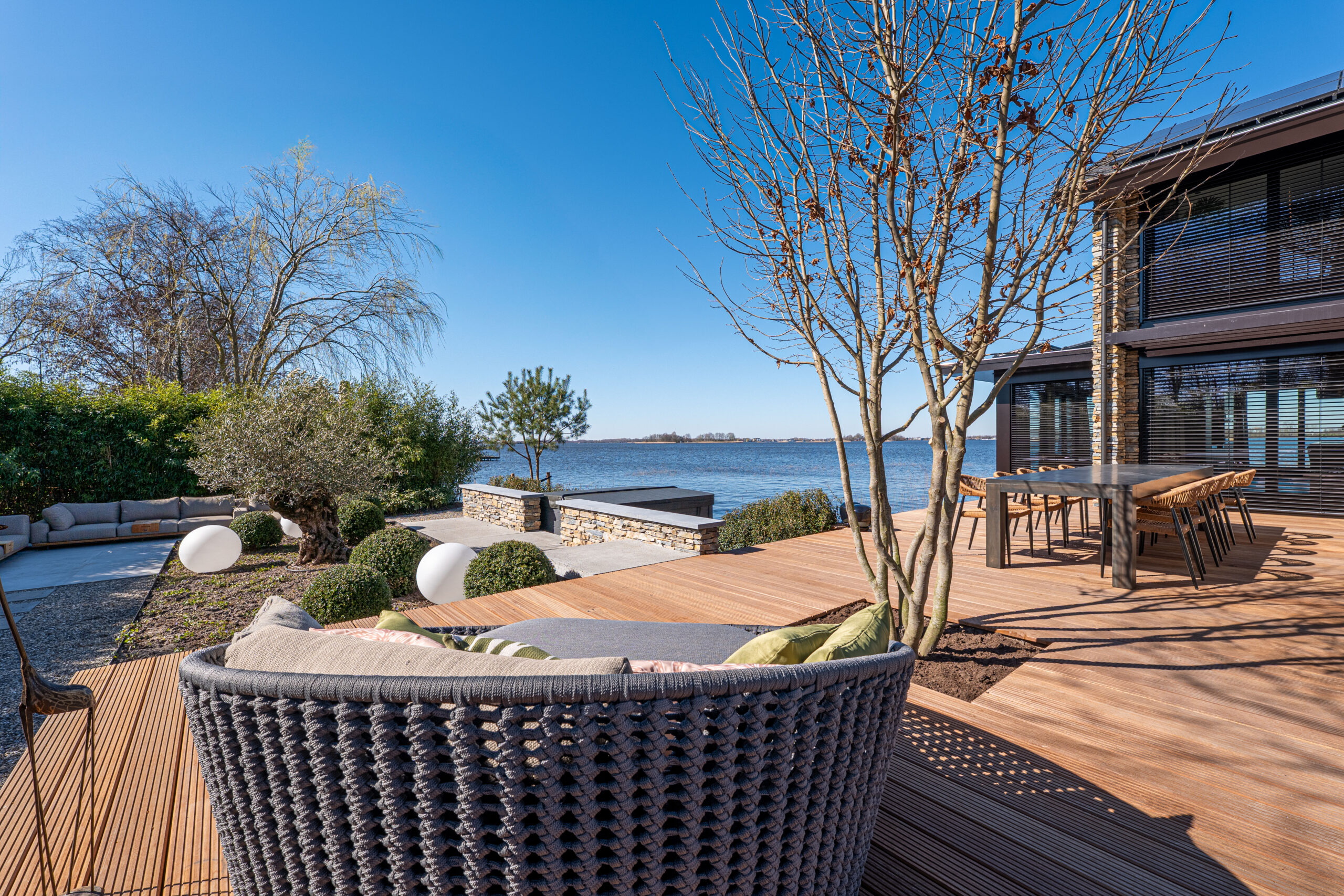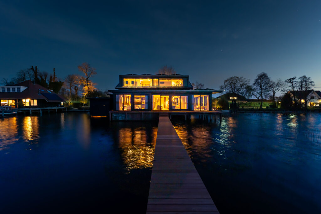 Op een unieke plek aan de Loosdrechtse plassen staat deze moderne villa die direct opgaat in het omliggende waterlandschap. De gevels zijn deels bekleed met onze gneis Natuurgevelsteen Bukarest, die met zijn rijke schakeringen en gelaagde structuur een stoer, natuurlijk karakter toevoegt. Het samenspel van steen, hout en grote glasvlakken geeft de woning een warme maar eigentijdse uitstraling. Dankzij de combinatie van hoogwaardige materialen en de unieke ligging ontstaat een exclusieve woonbeleving aan het water.