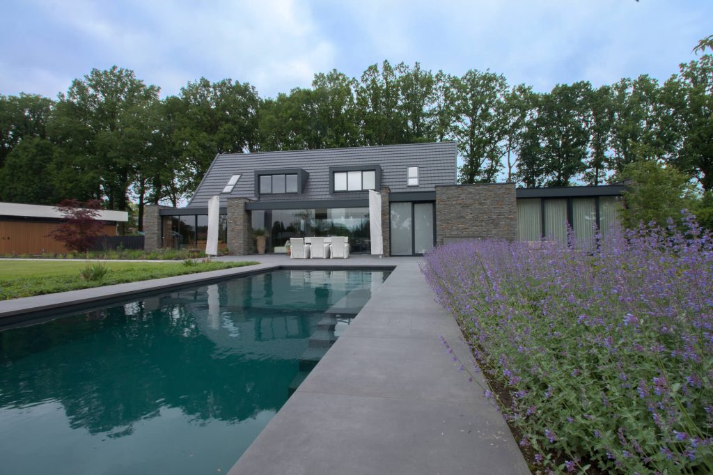 Deze woning bevat alles wat een moderne villa zou moeten bevatten. Strakke belijning, wit stucwerk, grote raampartijen en donkere kozijnen. Om sfeer en karakter aan de woning te geven, werd natuursteen toegepast. Er is gekozen voor onze sortering Pilsen. Deze gneis mix van zowel grijze als bruine kleurnuances geeft een mooi contrast met de andere materialen. De tuin is schitterend aangelegd, wat het totaalplaatje helemaal af maakt.