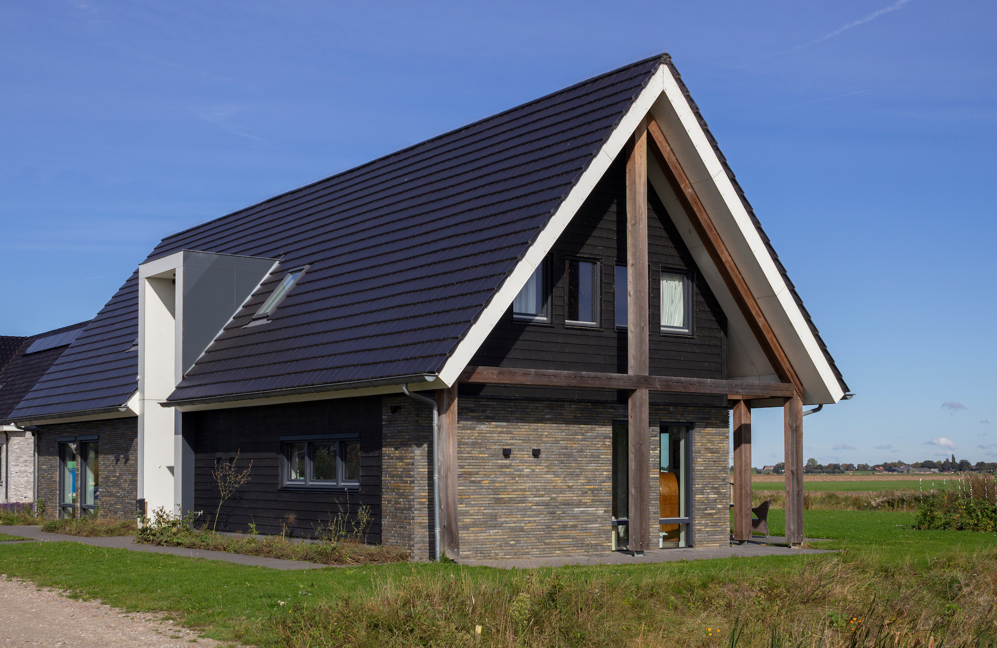 In Langeraar realiseerde wij een moderne schuurwoning waarin natuurlijke materialen de hoofdrol spelen. De gevel is uitgevoerd met de Lapide Bricks KV12, een genuanceerde steen met warme grijs- en zandtinten die zorgen voor een stijlvolle, eigentijdse uitstraling. De combinatie van deze steen met zwart houten delen en robuuste houten kolommen geeft de woning karakter en rust. De Lapide Bricks KV12 versterken het ambachtelijke karakter van de woning en sluiten perfect aan bij het landelijke landschap rondom Langeraar. Een harmonieus geheel waarin modern design en natuursteen elkaar versterken – precies zoals NG Bouwen met Natuursteen dat voor ogen heeft.