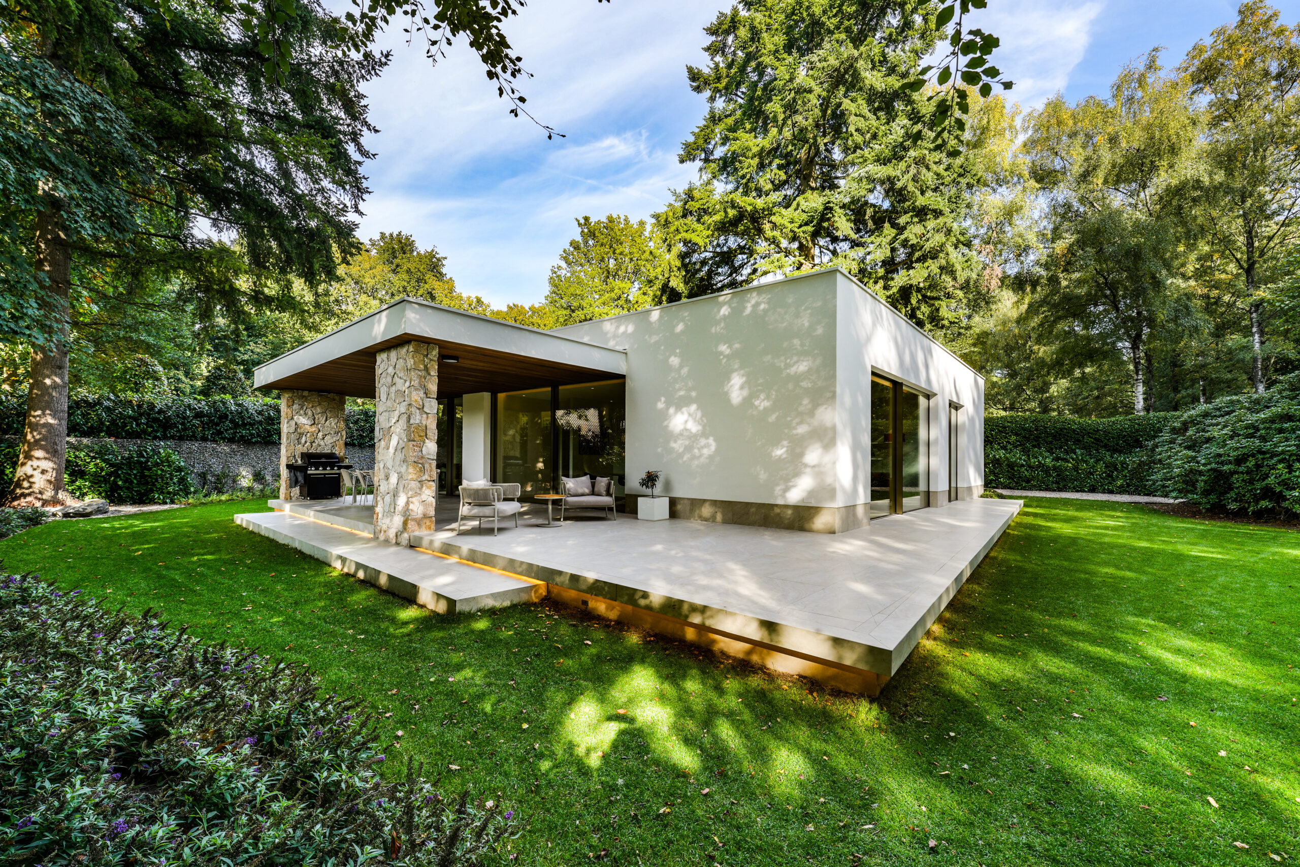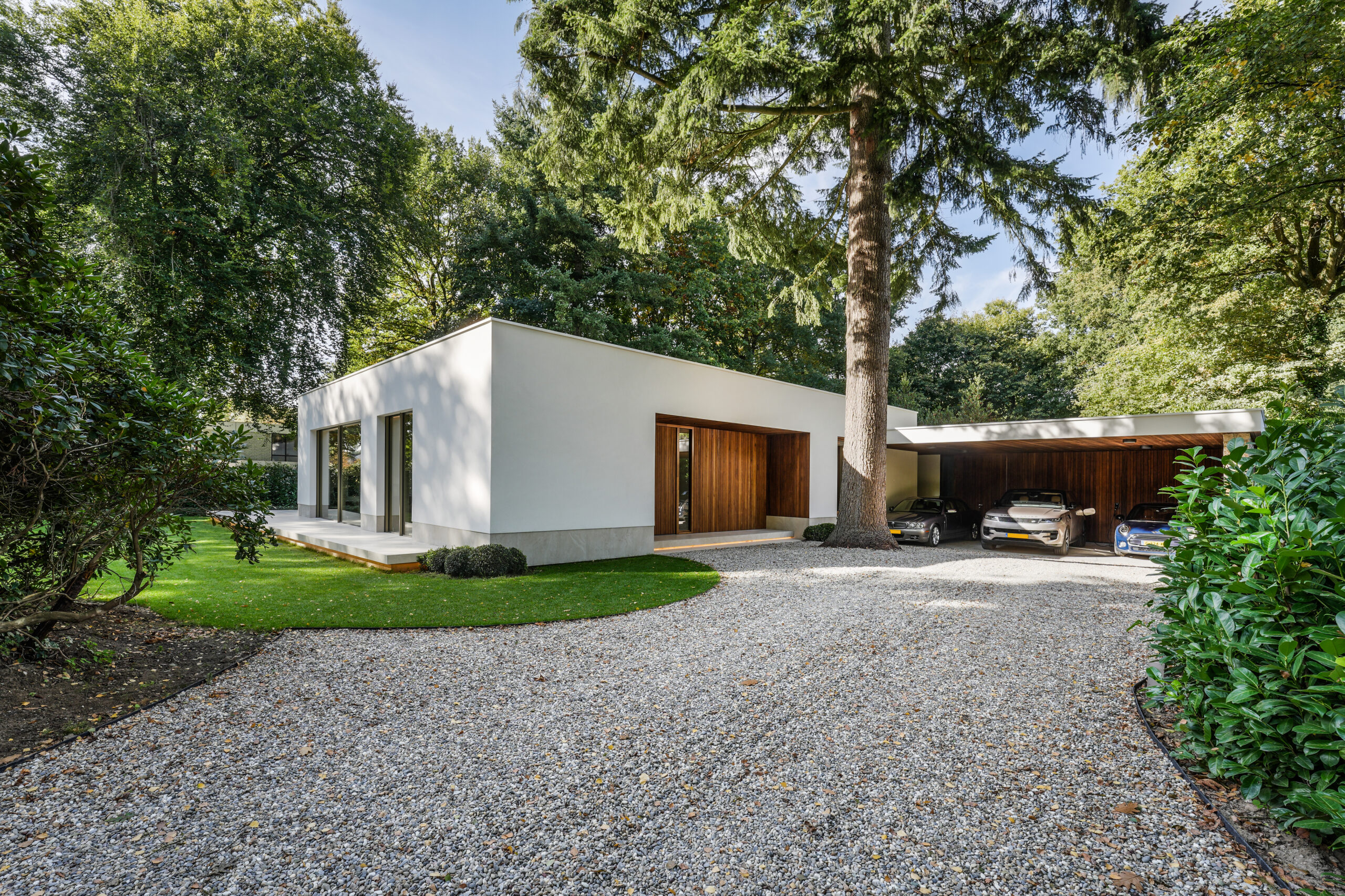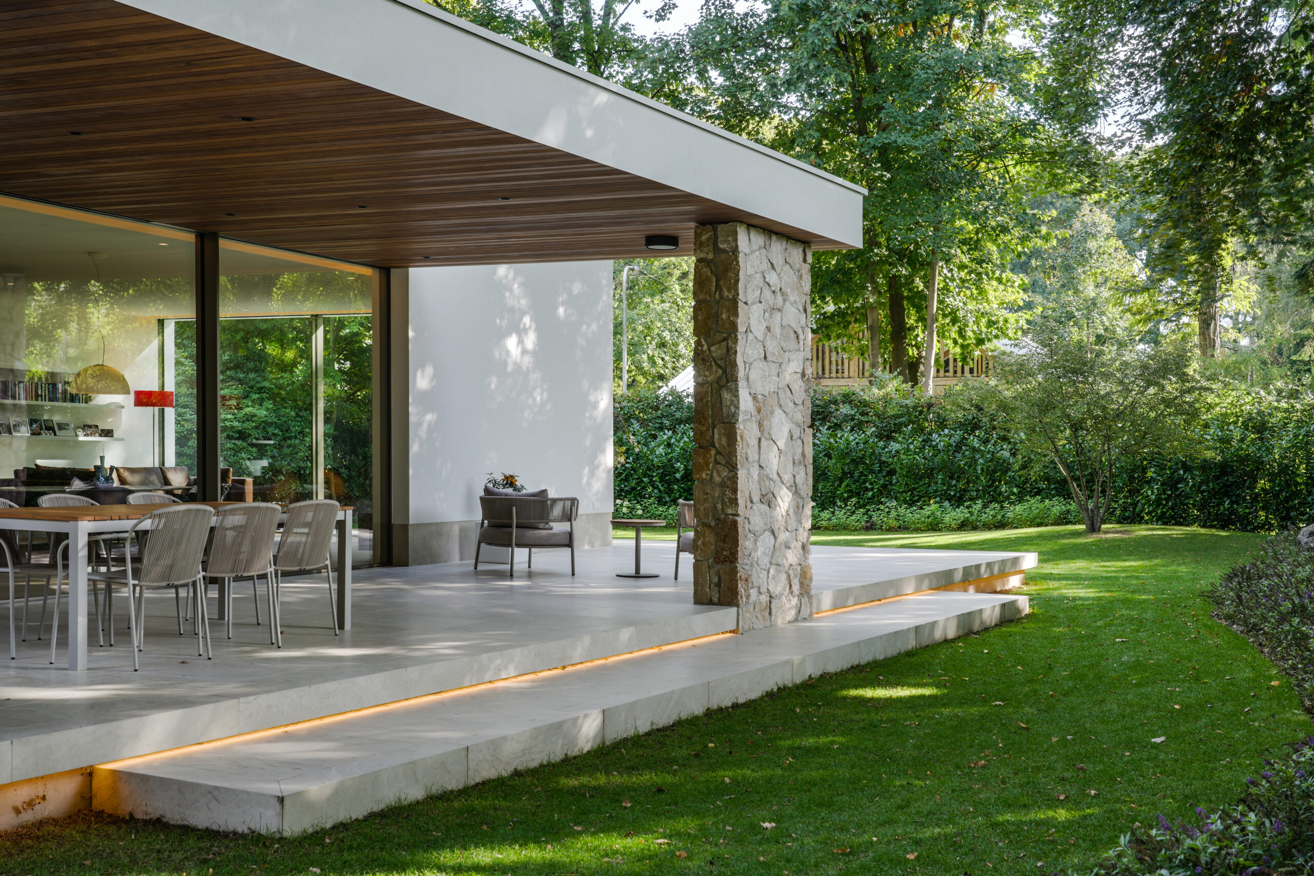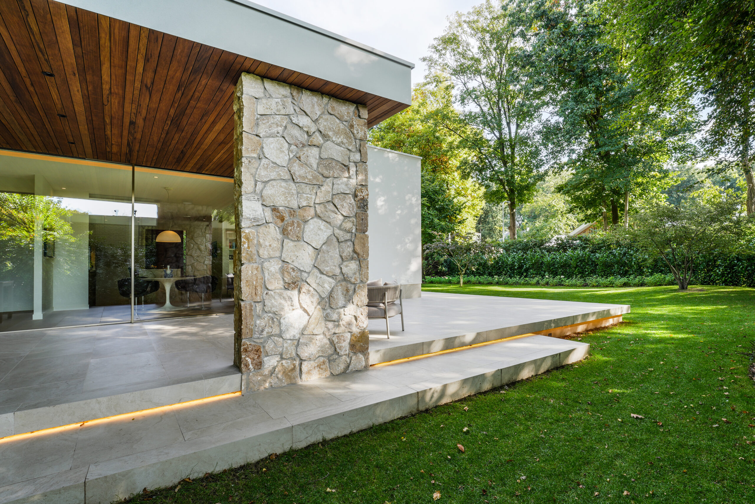 Deze moderne bungalow in Bennekom is een harmonieuze combinatie van strakke architectuur en natuurlijke materialen. Het minimalistische witte volume wordt prachtig verzacht door warm hout en stoere natuursteen accenten, die zowel binnen als buiten subtiel terugkeren. De royale overkapping met robuuste natuurstenen kolommen vormt een naadloze overgang tussen woning en tuin, terwijl de grote glaspartijen het groene landschap naar binnen halen. Een tijdloze woning waarin rust, luxe en natuur perfect samenkomen. Fotografie: Robert Koelewijn Fotografie.