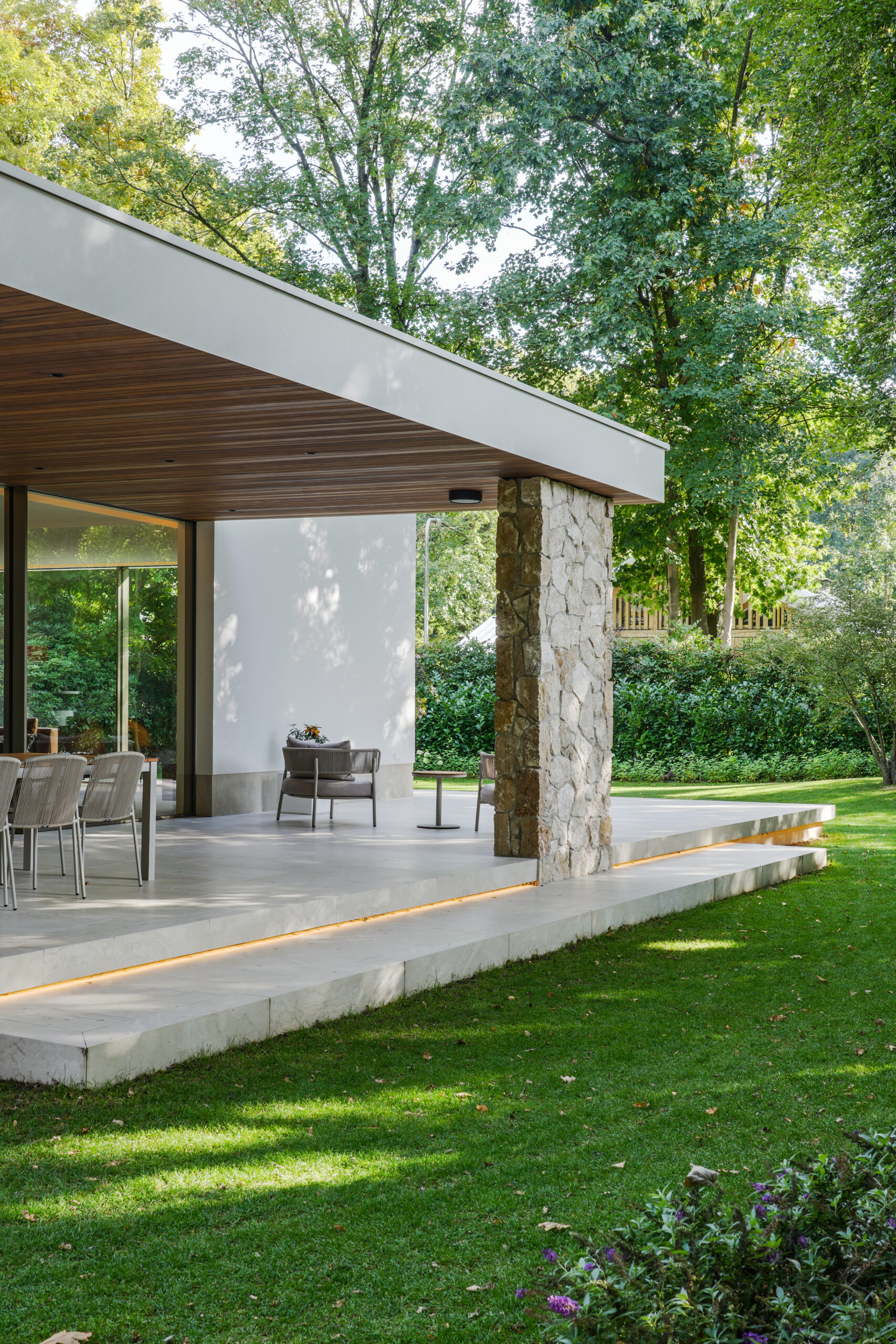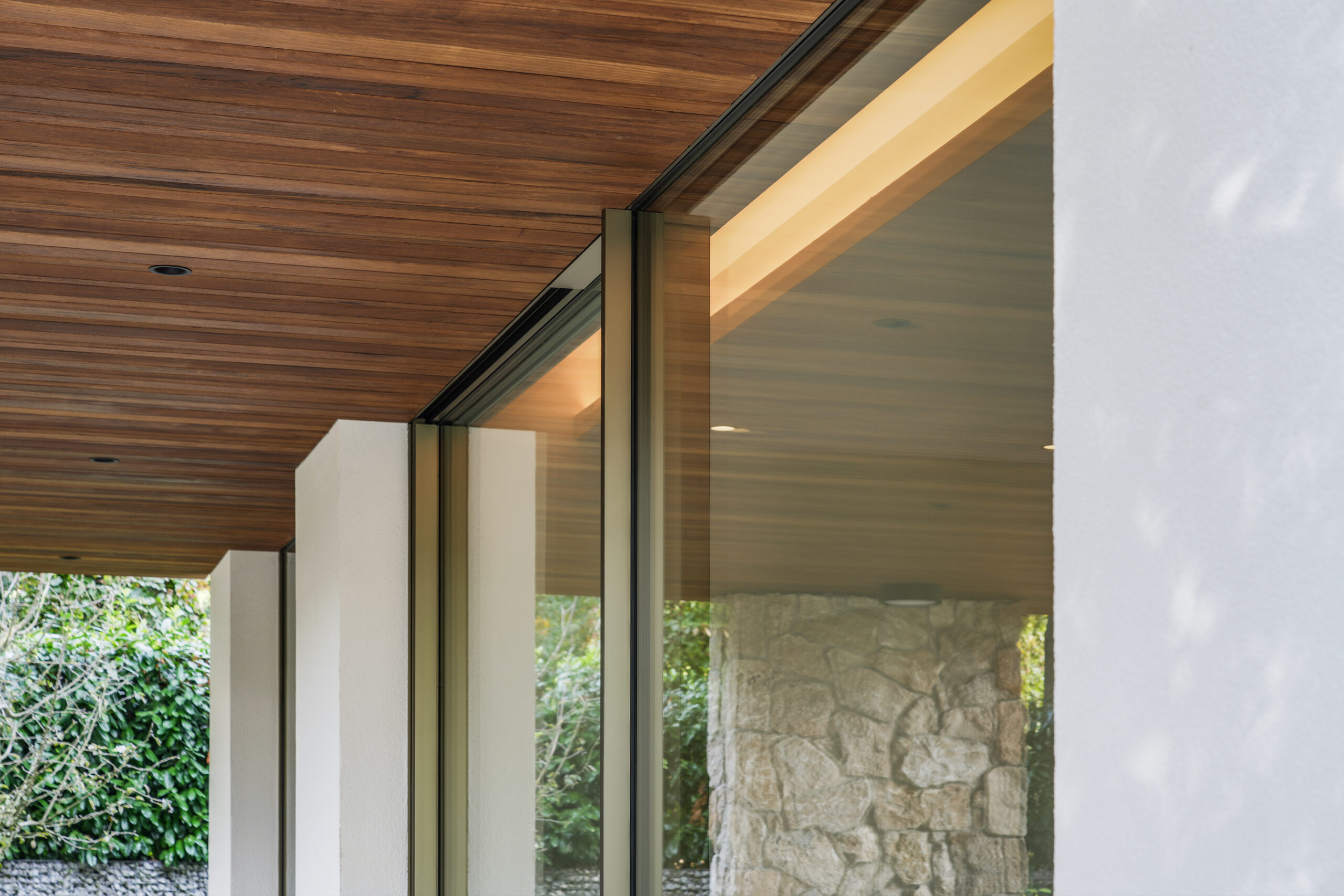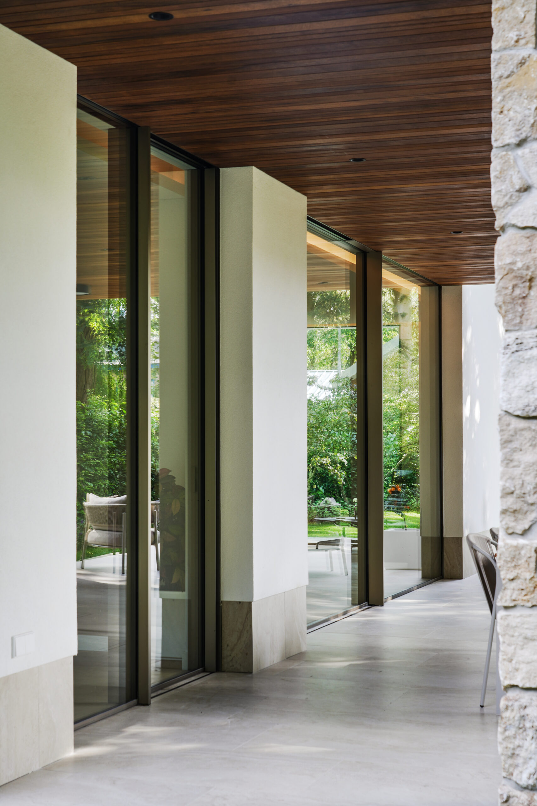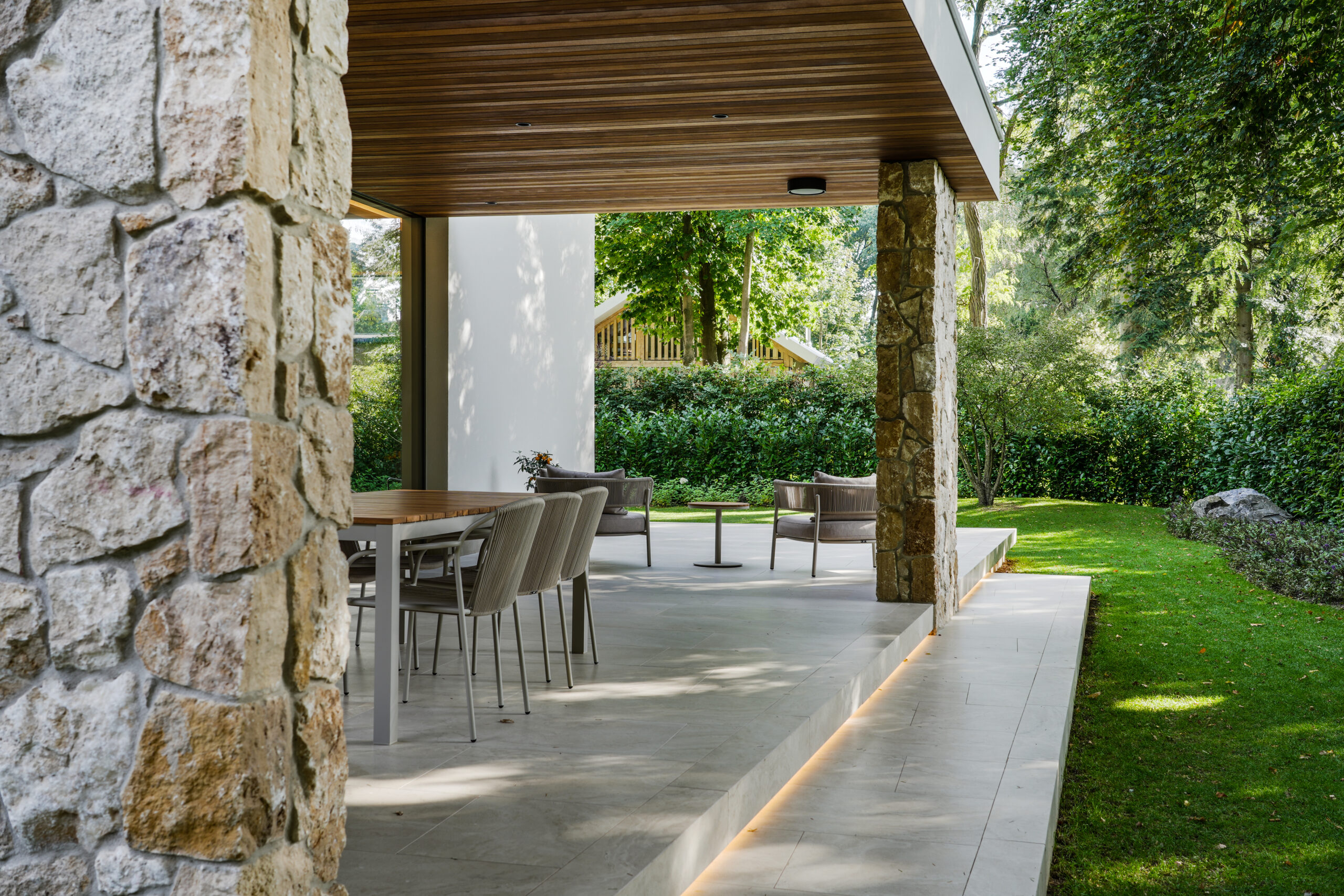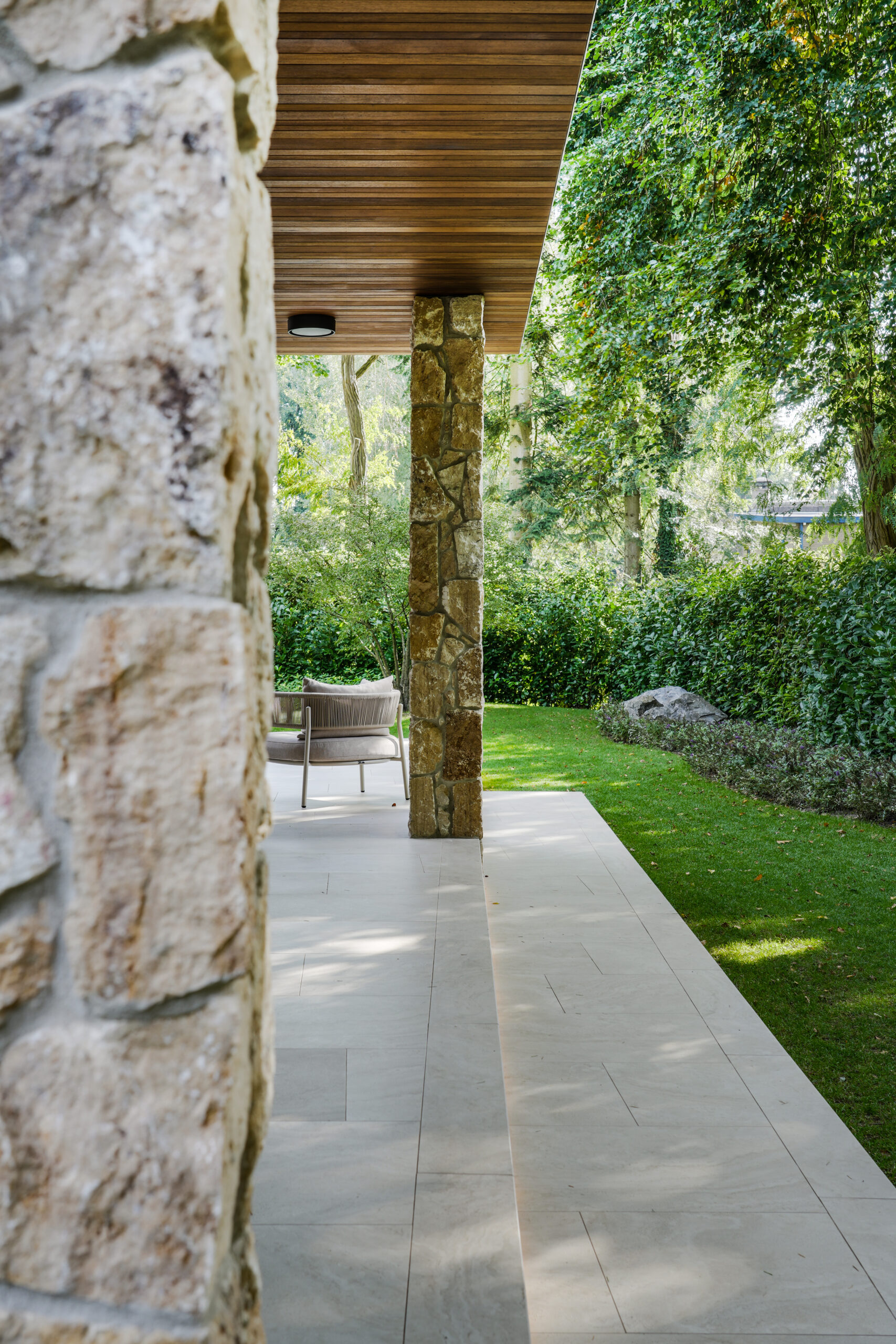 Deze moderne bungalow in Bennekom is een harmonieuze combinatie van strakke architectuur en natuurlijke materialen. Het minimalistische witte volume wordt prachtig verzacht door warm hout en stoere natuursteen accenten, die zowel binnen als buiten subtiel terugkeren. De royale overkapping met robuuste natuurstenen kolommen vormt een naadloze overgang tussen woning en tuin, terwijl de grote glaspartijen het groene landschap naar binnen halen. Een tijdloze woning waarin rust, luxe en natuur perfect samenkomen. Fotografie: Robert Koelewijn Fotografie.