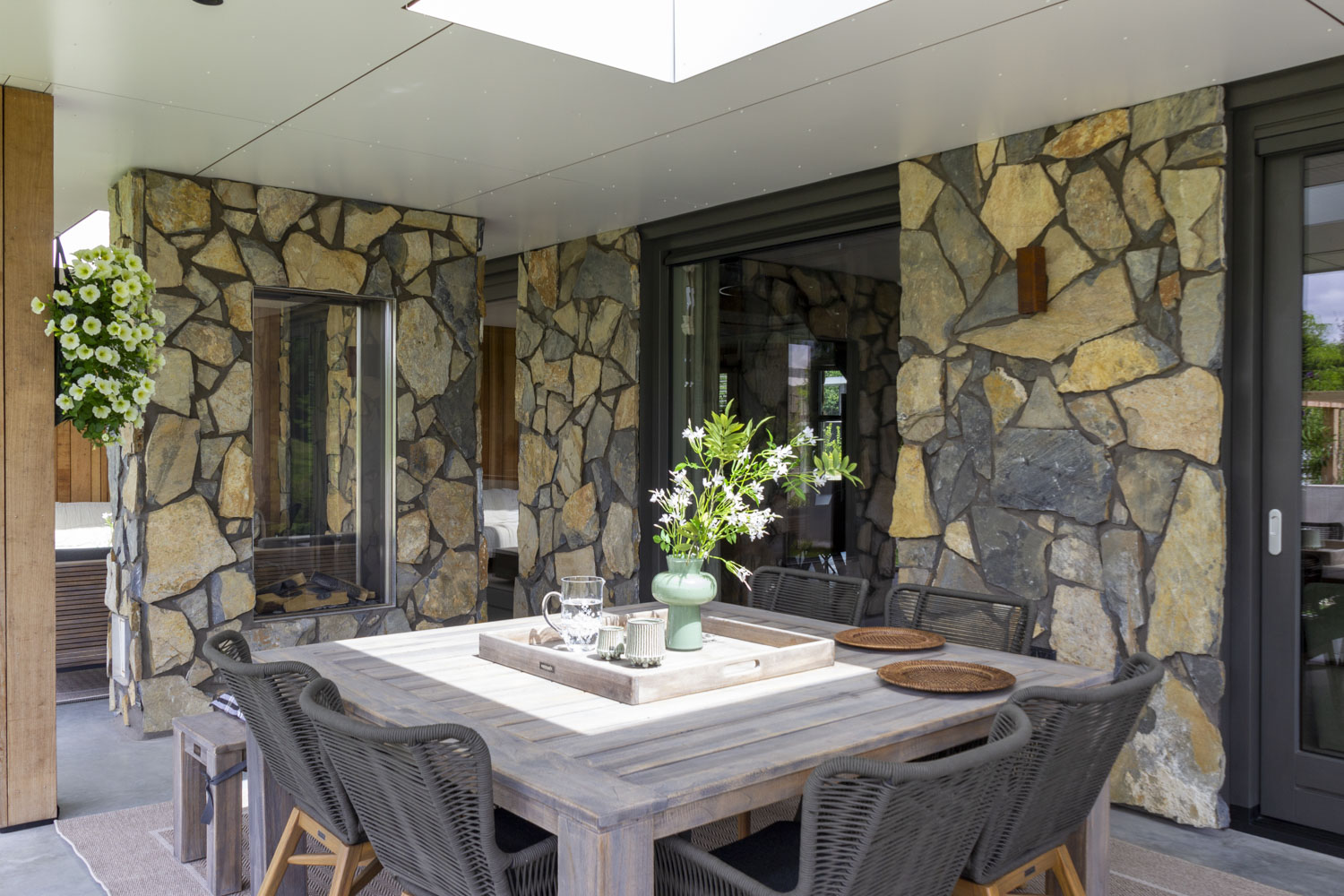 Aan de achterzijde van de villa is Rock Bukarest ook toegepast op het terras. Niet alleen de wanden zijn voorzien van NG Rock, maar ook de buitenhaard. Het is een prachtige haard met doorkijkje van de loungehoek naar de buiten eettafel. Het zorgt voor een samenhangend geheel.