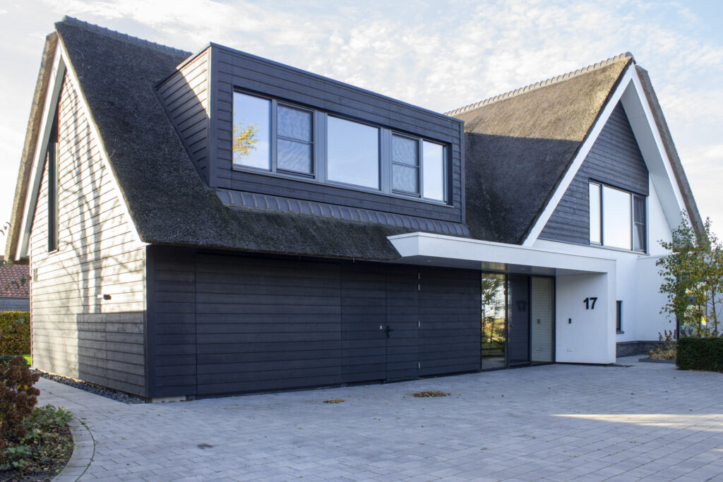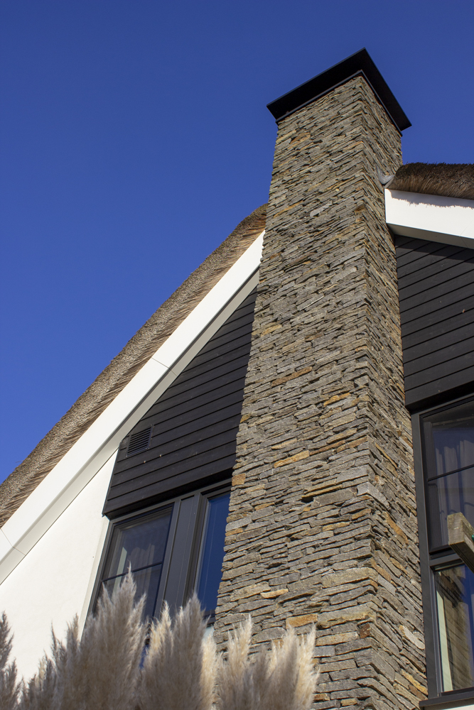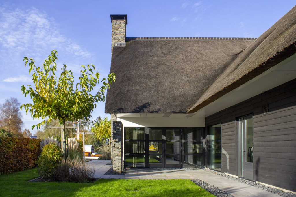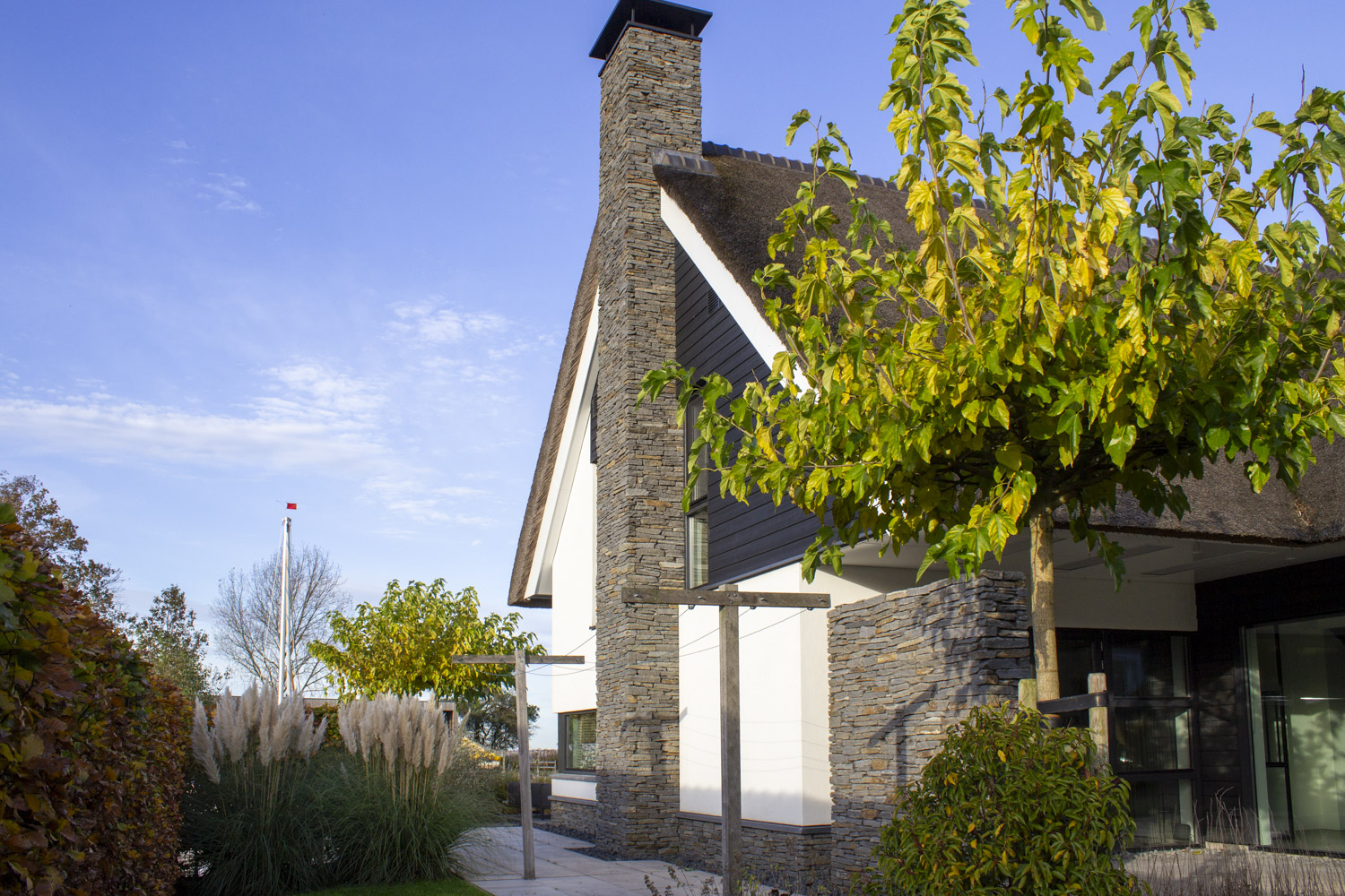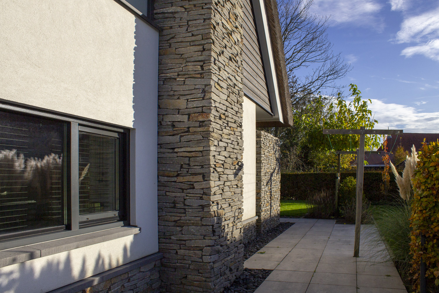 Deze moderne villa in Langweer combineert verfijnde architectuur met pure ambacht. Het natuurlijke rieten dak, de strakke zwarte gevelbekleding en de karakteristieke Karlovy Vary Natuurgevelsteen vormen samen een krachtige en tijdloze uitstraling. De zorgvuldig gemetselde hoekdetails en het subtiele lijnenspel laten zien hoe esthetiek en vakmanschap elkaar versterken. Een exclusief thuis waarin materiaal, vorm en omgeving volledig in balans zijn.